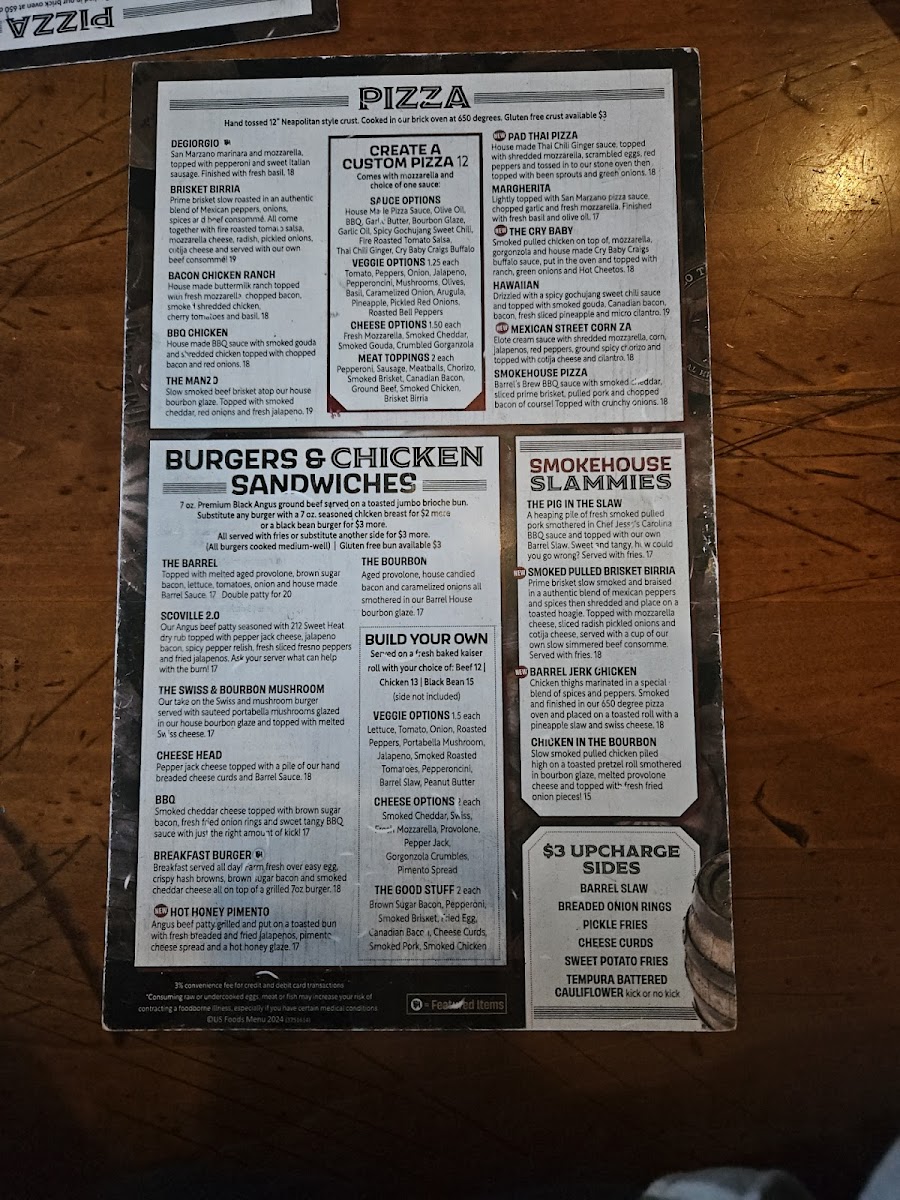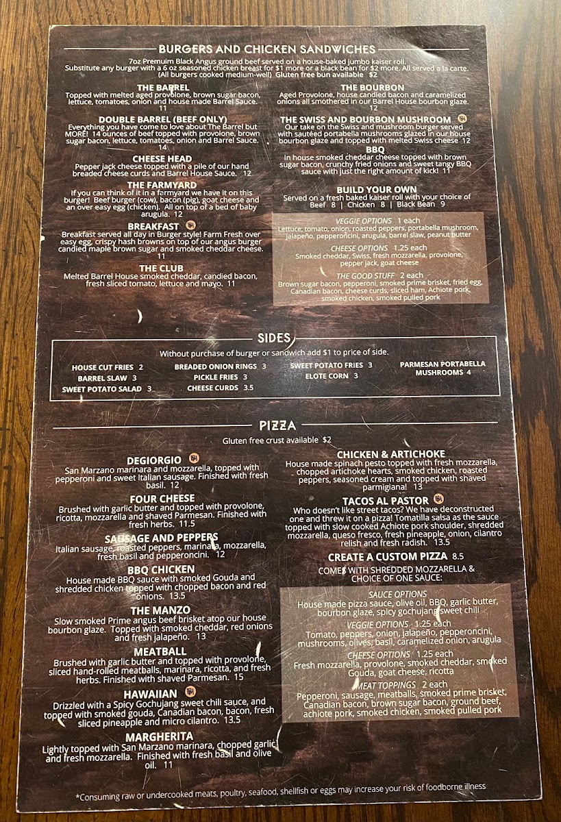 Light pizza sauce and ketchup topped with cheddar cheese, ground beef, chopped up bacon, diced pickles, chopped onion and our house made barrel sauce.